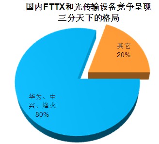 4、國內(nèi)FTTX和光傳輸設(shè)備競爭呈現(xiàn)三分天下的格局,華為、中興、烽火占據(jù)近80%的市場份額。預(yù)計在光通信設(shè)備領(lǐng)域的此種競爭格局,在未來仍將得以持續(xù),國內(nèi)設(shè)備商的份額將穩(wěn)中有升。