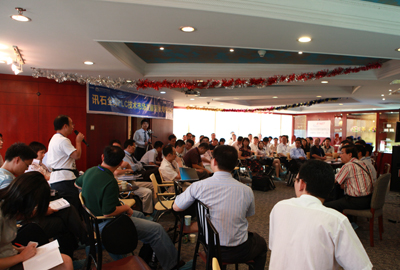 本次論壇的最后一個重頭戲是:討論環(huán)節(jié)。石明董事長作為主持人,與華博士、李總、梁總、朱總、程總、金總等講師們以及劉弘度老師等與各位聽眾面對面地坐著,接受各公司代表們的提問。為節(jié)約時間以及不紊的秩序,我們選取了多家公司一一提問的方式。提問者也充分把握這次難得的機(jī)會,向臺上的各位“頂尖”人物提出自己心中的疑問。各位老總們也熱情地回答了提問者的每個問題。