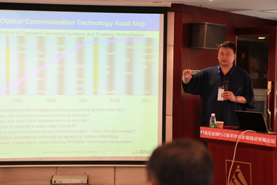 接下來,JDSU的PLC負(fù)責(zé)人華一敏博士與大家分享《全球PLC技術(shù)發(fā)展趨勢》。從PLC、PIC、波導(dǎo)技術(shù)、40G&100G解決方案,深入淺出、思路清晰,贏得了大部分參會者的認(rèn)同。下一個演講者也令大家十分期待,他就是光迅科技副總經(jīng)金正旺先生。他的演講題目也挑起了大家的濃厚興趣:《PLCS市場競爭與贏利模式》。他一上臺便先感謝大家對光迅上市的關(guān)注與祝福。之后,金總從FTTH市場、PLCS市場的商業(yè)模式、競爭模式、市場整合、競爭優(yōu)勢分析、市場趨勢等方面對PLCS市場競爭與贏利模式進(jìn)行了詳細(xì)而獨到的解說。