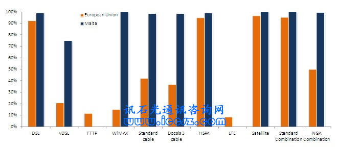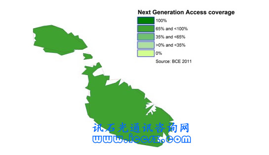 《2011歐洲寬帶覆蓋》調(diào)研報告顯示,馬耳他的基本寬帶(至少提供144kbps的服務(wù),只要他們愿意)覆蓋達(dá)到100%,超高速寬帶(也稱為NGA,即下一代接入)覆蓋超過99%。在調(diào)研的29個國家中(歐盟27國和挪威、冰島),96%能夠獲得基本寬帶,超過50%(一半國家走向2020數(shù)字天堂目標(biāo))能夠獲得超高速。