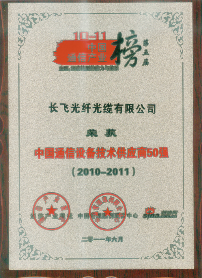 2011年第五屆通信產(chǎn)業(yè)榜評選6月29日在京舉行,該活動(dòng)是由通信產(chǎn)業(yè)報(bào)聯(lián)合國內(nèi)知名媒體共同主辦的完全公益型活動(dòng)。此次活動(dòng)共評選出行業(yè)內(nèi)“運(yùn)營商50強(qiáng)”、“設(shè)備商50強(qiáng)”及“互聯(lián)網(wǎng)50強(qiáng)”,長飛公司連續(xù)五次獲得“設(shè)備商50強(qiáng)”榮譽(yù)稱號(hào)。