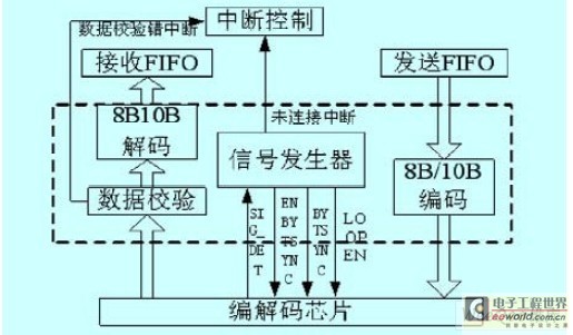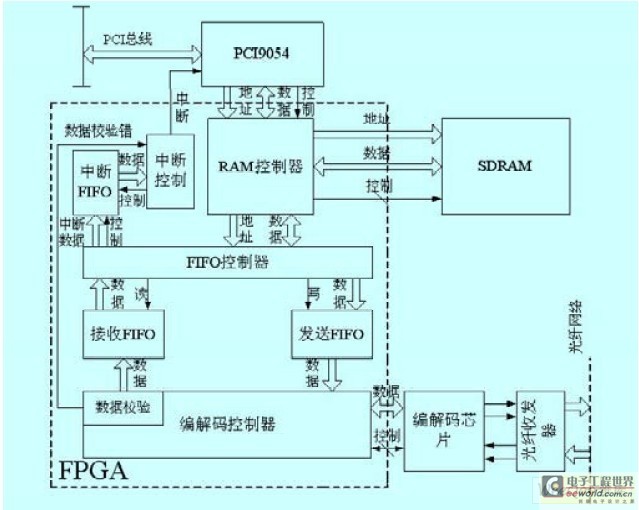 其中,F(xiàn)PGA 內(nèi)部包含SDRAM控制器和FIFO 控制器、編解碼控制器、接收FIFO、發(fā)送FIFO、中斷FIFO及中斷控制等。FPGA 選用Cyclone II 系列的EP2C35F484C7;PCI 選用PLX 公司的PCI9054,能夠提供兩個獨立的DMA 引擎,每個都可以進(jìn)行讀寫,在一個DMA 讀取數(shù)據(jù)的同時另一個DMA 可以寫入數(shù)據(jù),加快系統(tǒng)工作速度; 編解碼芯片選用安捷倫的H D M P -1636A,提供十位的并行IO,串行數(shù)據(jù)傳輸速率達(dá)1062.5MBd,負(fù)責(zé)數(shù)據(jù)串并行和并串行轉(zhuǎn)換,以便與光纖收發(fā)器內(nèi)部數(shù)據(jù)格式進(jìn)行匹配; 光纖收發(fā)器選用安捷倫的HFBR-57L5AP,支持多模光纖,串行傳輸速率達(dá)1.0625Gb/s,負(fù)責(zé)將電信號轉(zhuǎn)化為光信號, 通過光纖向下一節(jié)點傳輸。