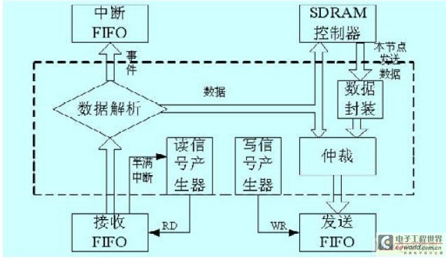 在峰值速率下進(jìn)行數(shù)據(jù)傳輸,SDRAM 存儲器很難達(dá)到要求,所以使數(shù)據(jù)經(jīng)過FIFO 緩存后發(fā)送或接收,可以降低了對存儲器傳輸速率的要求, 實現(xiàn)較高的傳輸速率。設(shè)計了FIFO 控制器,它由數(shù)據(jù)解析、數(shù)據(jù)封裝、仲裁、讀信號產(chǎn)生器、寫信號產(chǎn)生器組成。FIFO 控制器結(jié)構(gòu)如圖3 所示。