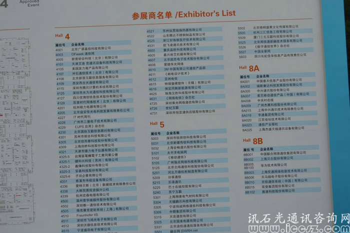 本屆展覽會(huì)主要分為八大區(qū)參與展出。1A展區(qū)主要參與展商有:中國移動(dòng)、大唐通信、三星、中國衛(wèi)通集團(tuán)有限公司、TD產(chǎn)業(yè)聯(lián)盟、浩瀚深度等企業(yè)。1B展區(qū)主要參與公司有中國電信、烽火科技、通鼎、硅展科技、NEC、斐訊、丹騰、銓高等公司。2號(hào)館展出主題為智能生活。3號(hào)館展出主題為無線通信與綠色節(jié)能,參與展出的企業(yè)主要有大譜、新盛電器、科地通信、通宇通訊、納特通信、成都華邁、武漢力興等。4號(hào)館參展主題為光通信及測(cè)試設(shè)備,參與展商主要有長飛、盛田、歐飛凌、怡亞通、德力儀器、西古光通、3M等公司。5號(hào)館為虛擬運(yùn)營商區(qū)域,主要有國美、蘇寧互聯(lián)、天音移動(dòng)、樂語通訊、巴士在線、迪信通通信、分享通信、北緯通信等。8A展館主要參與公司有設(shè)備巨頭中興、中國普天、亨通、瑞斯達(dá)康、杰賽、俊知、SONY、上海中興等企業(yè)。8B展區(qū)則有全球領(lǐng)先設(shè)備商華為、上海貝爾、中國聯(lián)通、京信通信、天馬、雙登等企業(yè)。