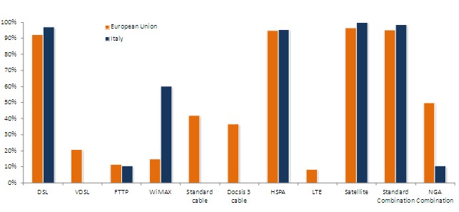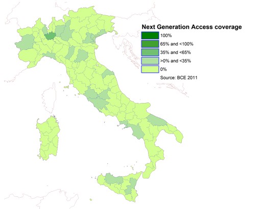 《2011歐洲寬帶覆蓋》調(diào)研報(bào)告顯示,意大利基本寬帶(至少提供144kbps的服務(wù),只要他們?cè)敢猓┘彝ジ采w達(dá)到99%,超高速寬帶覆蓋接近11%(也稱(chēng)為NGA,即下一代接入)。在調(diào)研的29個(gè)國(guó)家中(歐盟27國(guó)和挪威、冰島),96%能夠獲得基本寬帶,超過(guò)50%(一半國(guó)家走向2020數(shù)字天堂目標(biāo))能夠獲得超高速。