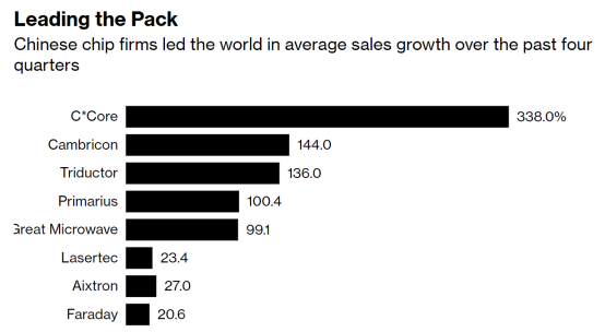 根據(jù)彭博匯編的數(shù)據(jù),在過(guò)去四個(gè)季度中,全球 20 家增長(zhǎng)最快的芯片行業(yè)公司中,有 19 家來(lái)中國(guó)大陸。相比之下,去年同期只有 8 個(gè)。如果從增長(zhǎng)速度的角度看,這些對(duì)芯片制造至關(guān)重要的設(shè)計(jì)軟件、處理器和設(shè)備的中國(guó)供應(yīng)商數(shù)倍于臺(tái)積電或 ASML 等大型半導(dǎo)體公司。