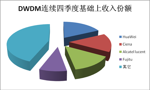 該研究還指出DWDM市場(chǎng)在各地區(qū)均有所增長(zhǎng),同比增長(zhǎng)率最高的地區(qū)是EMEA和拉美地區(qū),二者的增長(zhǎng)率均超過50%。設(shè)備供應(yīng)商在過去四個(gè)季度(Q310-Q211)基礎(chǔ)上的收入份額如下: