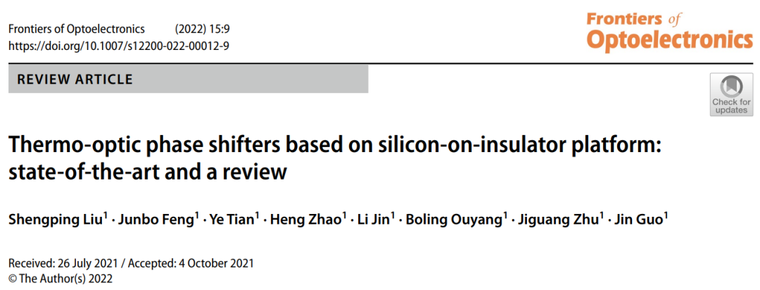 2022年4月12日,聯(lián)合微電子中心硅基光電子團(tuán)隊(duì)在Frontiers of Optoelectronics 期刊上發(fā)表了一篇以“Thermo?optic phase shifters based on silicon?on?insulator platform: state?of?the?art and a review”為題的綜述文章。