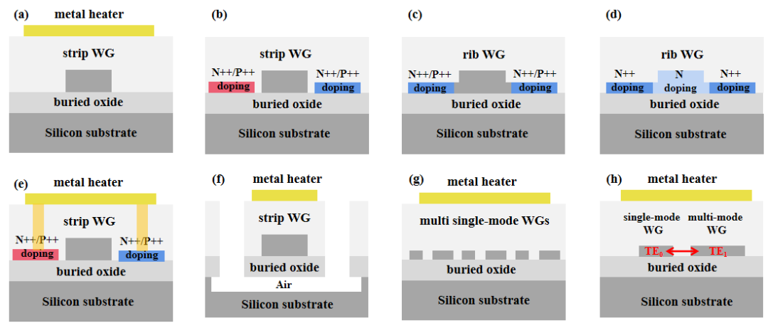 (c)由脊波導(dǎo)和摻雜波導(dǎo)加熱器構(gòu)成。(d)由輕摻脊波導(dǎo)和摻雜波導(dǎo)加熱器構(gòu)成。(e)由條形波導(dǎo)和金屬與摻雜波導(dǎo)混合加熱器構(gòu)成。
