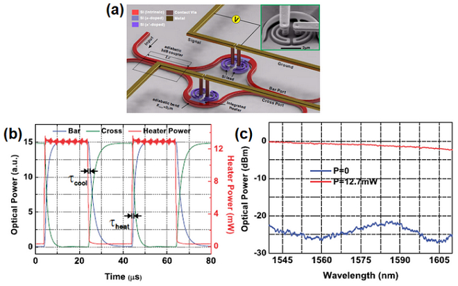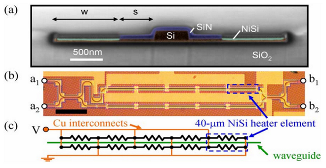 圖2. 脊形波導(dǎo)和鎳硅加熱器構(gòu)成的熱光移相器。(a)截面圖的掃描電鏡圖像。(b)測(cè)試移相器移相效率與開關(guān)時(shí)間的MZI結(jié)構(gòu)。(c)測(cè)試結(jié)構(gòu)的電路圖。
