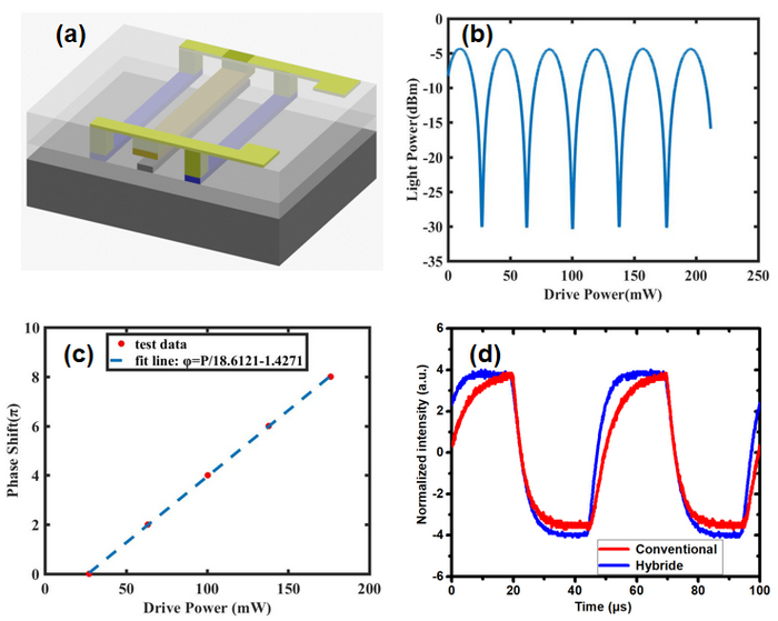 圖4. 混合型熱光移相器。(a)由金屬與摻雜波導(dǎo)并聯(lián)形成的加熱器結(jié)構(gòu)示意圖。(b)輸出光功率隨加熱器功耗的變化曲線。(c)光學(xué)相位隨驅(qū)動(dòng)功率的變化曲線。(d)與金屬加熱器的熱光移相器響應(yīng)曲線對(duì)比