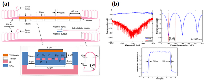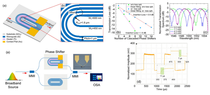 圖6. 超高效熱光移相器的結(jié)構(gòu)和測(cè)試結(jié)果圖。