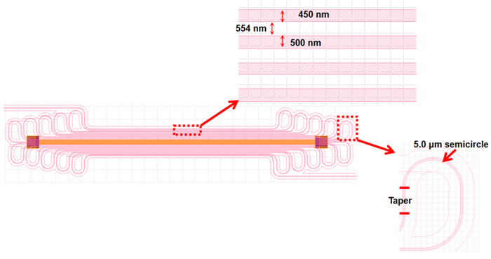 懸臂梁波導(dǎo)熱光移相器需要在波導(dǎo)周圍進(jìn)行隔熱槽和襯底掏空工藝,這些結(jié)構(gòu)面積大且工藝復(fù)雜,限制了移相器規(guī)模擴(kuò)展;同時(shí),懸臂梁波導(dǎo)熱光移相器調(diào)節(jié)速度慢,不適用于移相器需要調(diào)節(jié)的網(wǎng)絡(luò)。為了克服這些問題,2019年南加利福尼亞大學(xué)的SungWon Chung等人提出了一種高移相效率和小面積的熱光移相器,如圖7所示。移相器由寬度400 nm和500 nm 的單模波導(dǎo)間隔排列形成,相鄰波導(dǎo)中心間隔1000 nm,波導(dǎo)轉(zhuǎn)彎位置采用歐拉波導(dǎo)和錐形器件連接。這種結(jié)構(gòu)可以將移相效率提升至2.56mW/π,面積大約是0.0023 mm2,上升時(shí)間和下降時(shí)間大約是34.8 μs和34.4 μs,損耗為1.23 dB。