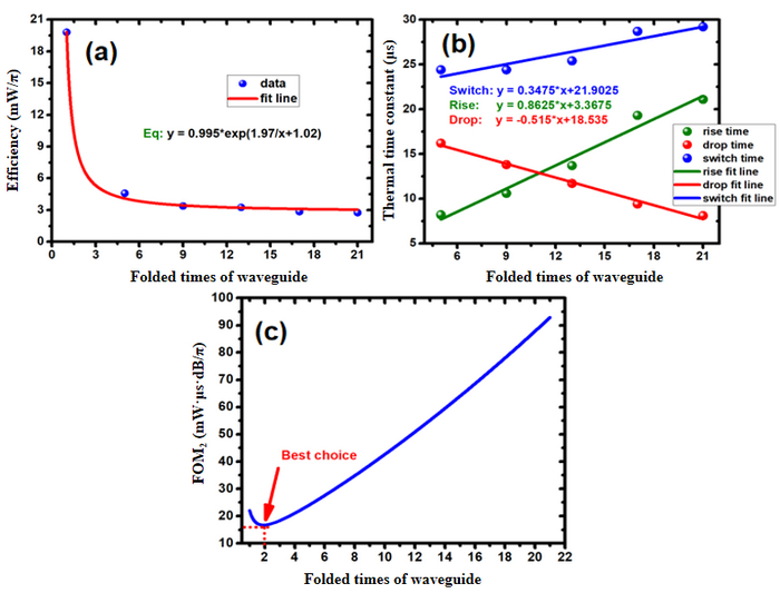 為了方便設(shè)計(jì)人員根據(jù)需求對(duì)高密度波導(dǎo)折疊次數(shù)進(jìn)行選擇,聯(lián)合微電子中心研究人員在硅基光電子工藝平臺(tái)對(duì)不同折疊次數(shù)的高密度熱光移相器進(jìn)行了測(cè)試,如圖9所示。實(shí)驗(yàn)結(jié)果顯示,當(dāng)需要綜合考慮移相效率、調(diào)節(jié)速度和波導(dǎo)損耗時(shí),選擇2根波導(dǎo)效果最優(yōu)。忽略波導(dǎo)數(shù)目增多帶來的傳播損耗,當(dāng)波導(dǎo)數(shù)目由3根變化成9根時(shí),移相器的品質(zhì)因子僅提升了三分之一。與懸臂梁波導(dǎo)熱光移相器相比,這種高密度波導(dǎo)熱光移相器兼顧了移相效率和調(diào)節(jié)速度,并且具有面積小、制造工藝簡(jiǎn)單等優(yōu)勢(shì),設(shè)計(jì)人員可以根據(jù)自身需求對(duì)高密度波導(dǎo)結(jié)構(gòu)進(jìn)行合理優(yōu)化。