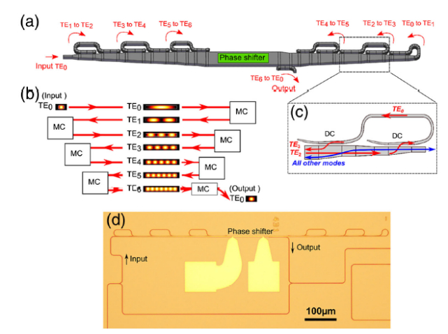 利用光的并行性提高熱光移相器移相效率是一種行之有效的方案,圖10展示了Michal Lipson教授團(tuán)隊(duì)設(shè)計(jì)并制作的一種基于模式轉(zhuǎn)換的波導(dǎo)復(fù)用熱光移相器,利用模式轉(zhuǎn)換器實(shí)現(xiàn)了TE0模到TE6模的逐級(jí)轉(zhuǎn)換,并將加熱器放置于中間波導(dǎo)上方,利用不同模式的光多次經(jīng)過受熱波導(dǎo)的特點(diǎn),實(shí)現(xiàn)了對(duì)受熱波導(dǎo)的復(fù)用,從而提高了熱光移相器移相效率。由于這種結(jié)構(gòu)只是對(duì)受熱波導(dǎo)進(jìn)行了復(fù)用,并沒有影響熱量的產(chǎn)生與耗散,所以調(diào)節(jié)速度并不會(huì)發(fā)生改變。實(shí)驗(yàn)顯示移相器的移相效率可以提升至1.7 mW/π,但是模式轉(zhuǎn)換器會(huì)帶來額外的損耗,不適用于多層移相器級(jí)聯(lián)形成的網(wǎng)絡(luò)。