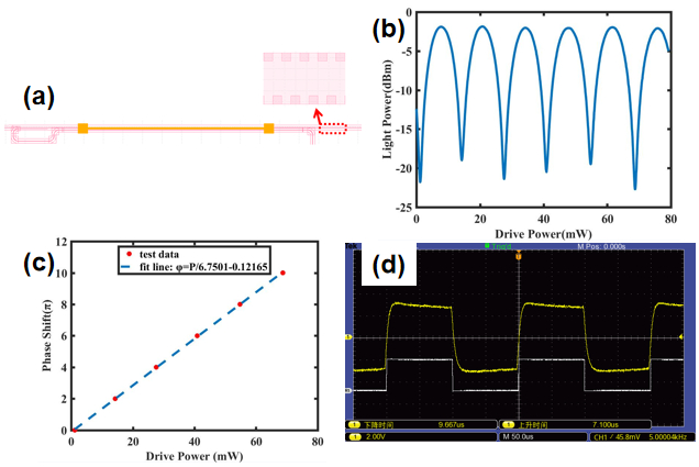 圖9. 高密度波導(dǎo)熱光移相器結(jié)構(gòu)與測(cè)試結(jié)果圖