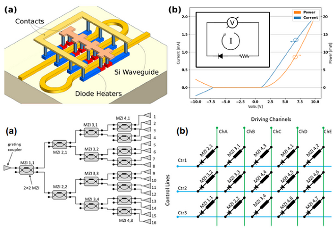 受益于硅基光電子成熟的制造工藝,熱光移相器被廣泛應(yīng)用于各種網(wǎng)絡(luò)中,但每個(gè)熱光移相器都需要兩個(gè)電學(xué)端口,當(dāng)網(wǎng)絡(luò)規(guī)模擴(kuò)大時(shí),電學(xué)端口數(shù)目呈冪增長(zhǎng),這極大地限制了網(wǎng)絡(luò)規(guī)模的擴(kuò)展。為了解決這個(gè)問題,根特大學(xué)的Wim Bogaerts團(tuán)隊(duì)提出了一種可尋址熱光移相器結(jié)構(gòu),如圖12所示。熱光移相器的加熱器由二極管構(gòu)成,通過脈沖寬度調(diào)節(jié)的方式實(shí)現(xiàn)對(duì)移相器相位的任意調(diào)節(jié)。對(duì)于由M×N個(gè)可尋址熱光移相器構(gòu)成的M行N列網(wǎng)絡(luò),僅需(M+N)個(gè)電學(xué)端口,就能在時(shí)分復(fù)用的方式下實(shí)現(xiàn)對(duì)網(wǎng)絡(luò)中移相器的任意調(diào)節(jié),減少了電學(xué)端口數(shù)目,對(duì)于大規(guī)模集成光子的發(fā)展具有重要的意義。