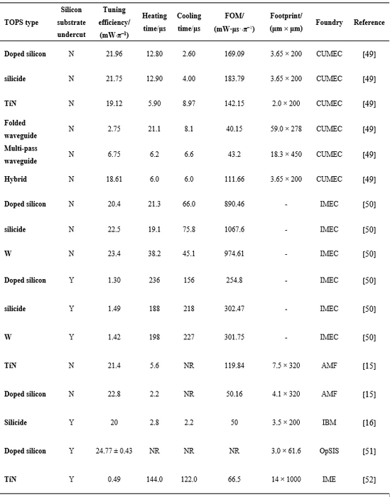 熱光移相器具有成本低、制作簡(jiǎn)單和良率高的優(yōu)勢(shì),在硅基光電子芯片中起著至關(guān)重要的作用。本文綜述了SOI平臺(tái)上熱光移相器的發(fā)展現(xiàn)狀和潛在趨勢(shì),從移相器的移相效率、調(diào)制速度、面積和損耗等不同維度進(jìn)行了分析與比較,并對(duì)CUMEC工藝平臺(tái)熱光移相器的特色與優(yōu)勢(shì)進(jìn)行了介紹,總結(jié)對(duì)比見下表。文章內(nèi)容能夠?yàn)槲磥砀咝Э焖傩⌒突臒峁庖葡嗥靼l(fā)展迭代提供基礎(chǔ)和思路。
