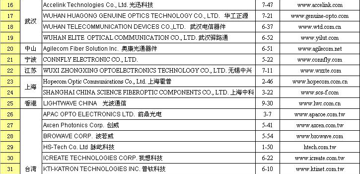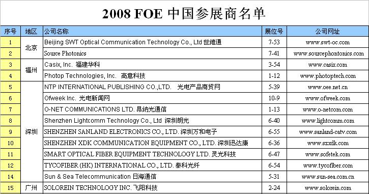 中國展商的顯著增加成為了一大亮點。本次FOE展會中國內(nèi)地共有二十多家企業(yè)參展,臺灣地區(qū)有十幾家企業(yè)參展。相比2007年的參展情況臺灣地區(qū)參展商沒有顯著的變化,但中國內(nèi)地展商增加近一半,除了世維通、高意科技、昂納通信、深圳朗光科技、日海通信、WTD、武漢光迅、奧康光通器件等幾家兩年都有參展外,今年新增加了深圳萬和電子、深圳迅達康、泰科光纖、飛陽科技等上十家新公司參展,通過產(chǎn)品分析這些新展商大部分以連接器、PLC、耦合器等無源器件為主,這些新的國內(nèi)企業(yè)也紛紛開始試水FOE希望打開日本市場,尋求新的商機。飛博創(chuàng)首次以Source Photonics名義亮相FOE。