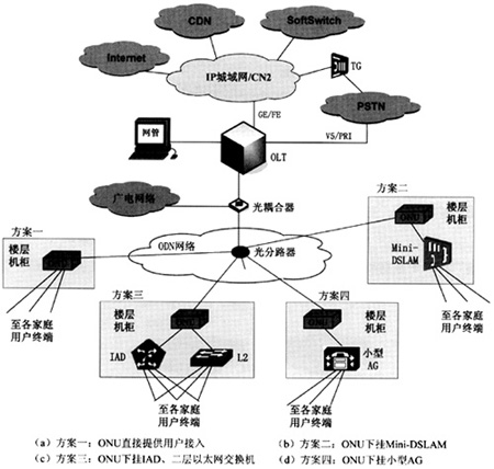 方案一:ONU提供FE、POTS、CATV視頻接口等用戶接口,可采用多用戶ONU或?qū)⒍鄠€(gè)單用戶ONU集中放置。