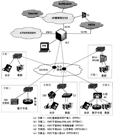 對(duì)于商業(yè)用戶,可以根據(jù)業(yè)務(wù)需求、用戶規(guī)模的不同,采取不同的實(shí)施模式:如FTTO(光纖到辦公室)和FTTB/C(光纖到大樓/路邊)。根據(jù)實(shí)施模式、接入方式的不同,可以采取5種實(shí)施方案(如圖3所示):