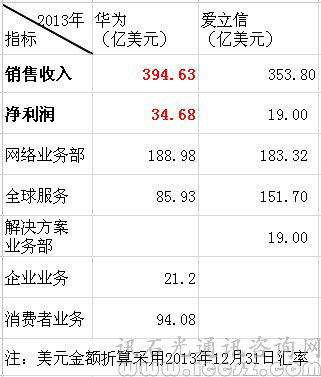 ICCSZ訊(編輯:Debi)3月31日,華為公布2013年年報(bào),全年實(shí)現(xiàn)銷售收入2390億元(約395億美元),同比增長(zhǎng)8.5%,凈利潤(rùn)210億元(約34.7億美元),同比增長(zhǎng)34.4%。此前愛立信公布的年報(bào)顯示,2013年愛立信營(yíng)業(yè)收入353億美元,與2012年基本持平,凈利潤(rùn)19億美元。