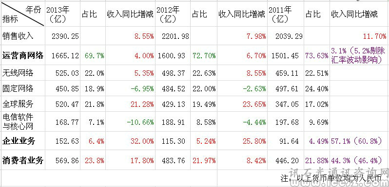 可以看出,華為運(yùn)營(yíng)商網(wǎng)絡(luò)收入占比由2011年的73.63%降至2013年的69.7%,而企業(yè)業(yè)務(wù)與消費(fèi)者業(yè)務(wù)收入的占比都在上漲,其中,企業(yè)業(yè)務(wù)收入占比由2011年的4.49%升至2013年的6.4%,消費(fèi)者業(yè)務(wù)收入占比由2011年的21.88%升至2013年的23.8%。雖然都是微幅變化,但是從這些細(xì)微變化中依然可以看出華為的態(tài)度來——華為近年來一直在加強(qiáng)企業(yè)方面的業(yè)務(wù)以及服務(wù)方面。小編在此有一絲憂慮,如果華為漸漸削弱運(yùn)營(yíng)商網(wǎng)絡(luò)收入的占比,恐怕在強(qiáng)大的競(jìng)爭(zhēng)對(duì)手面前會(huì)暴露出劣勢(shì),被超越是遲早的事。