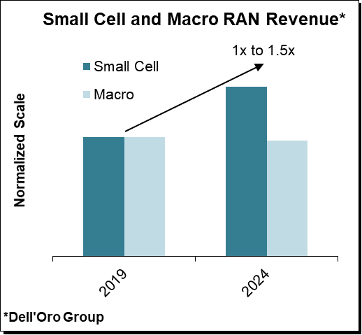 Small Cell的全球增長(zhǎng)前景依然樂(lè)觀。隨著運(yùn)營(yíng)商和企業(yè)探索新技術(shù)、頻譜和用例,Small Cell將在整個(gè)RAN網(wǎng)絡(luò)中扮演越來(lái)越重要的角色。Dell'Oro仍然預(yù)測(cè),在未來(lái)五年內(nèi),全球Small Cell累計(jì)投資將接近250億美元。室內(nèi)和室外領(lǐng)域部署的廣泛加速,驅(qū)動(dòng)Small Cell投資增長(zhǎng)速度遠(yuǎn)遠(yuǎn)快于宏RAN市場(chǎng)。