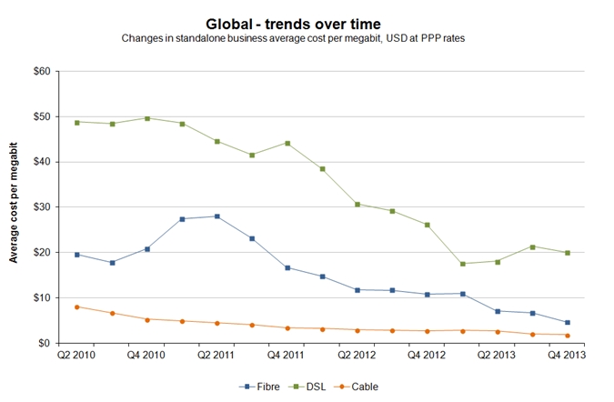 ICCSZ訊(編譯:Nina)Point Topic近日發(fā)布“全球住宅及商業(yè)寬帶服務(wù)資費(fèi)趨勢(shì)”報(bào)告。該報(bào)告顯示了從Q210到Q413期間企業(yè)和住宅寬帶服務(wù)每兆比特平均成本的變化趨勢(shì),其中涉及的寬帶接入服務(wù)包括銅線(DSL)、Cable和光纖。