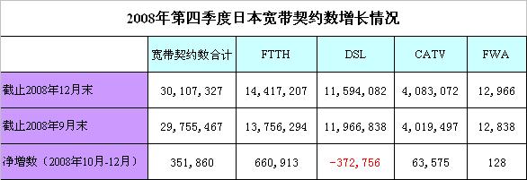 截止2008年第四季度,日本DSL寬帶接入契約數(shù)已經(jīng)連續(xù)13個季度在減少。雖然FTTH寬帶接入契約數(shù)增速放緩,但目前仍是增長最快的寬帶接入方式。