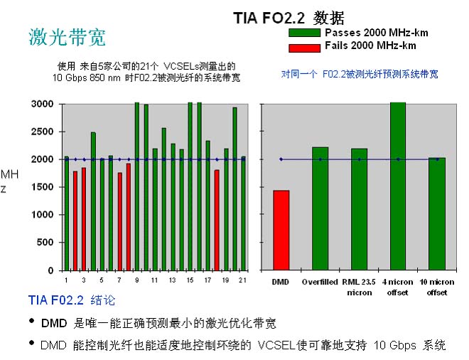 滿溢帶寬對激光發(fā)送器(通常使用于155Mb/s以上的應(yīng)用中)的最小帶寬性能承載能力較小,因?yàn)檫@些發(fā)送器的啟用條件相差甚遠(yuǎn),且通常無滿溢條件。RML帶寬也遭遇同樣的問題。開發(fā)RML實(shí)驗(yàn)的研究得出的結(jié)論僅適用于62.5µm光纖,只有當(dāng)與滿足特定啟用條件的發(fā)送器一起使用時(shí)才有效。沒有任何一項(xiàng)應(yīng)用采用這些啟用條件,研究顯示不滿足啟用條件的發(fā)送器普遍存在。最后,依賴對少部分光纖進(jìn)行試驗(yàn)而得出的結(jié)論,無法證明制造商知道該如何選擇優(yōu)良的性能。您必須提出質(zhì)疑。以下來自 TIA F02.2的測試數(shù)據(jù)和結(jié)論可以清楚地看到同一根光纖采用RML或其他的方法得到的帶寬可能遠(yuǎn)超過2000 MHz-km,但其DMD激光帶寬則更本達(dá)不到2000 MHz-km。