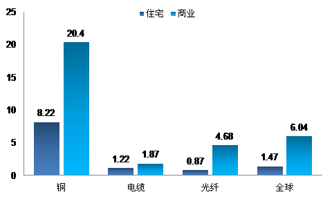 在住宅市場(chǎng),銅的服務(wù)提供的性價(jià)比最低。對(duì)于所有用戶來說商業(yè)用戶支付的錢比住宅用戶多得多,這反映了較高的使用率和平均帶寬,企業(yè)所需求的服務(wù)比一般用戶要多。
