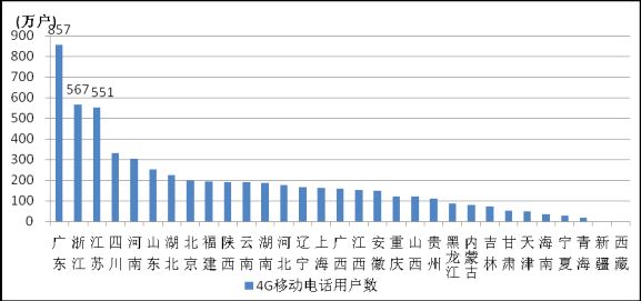 10月,東、中、西部地區(qū)4G移動電話用戶分別達(dá)到3202.7、12978、1276.3萬戶,其中超過50%的4G用戶集中在東部地區(qū),用戶占比達(dá)到55.4%。4G移動電話用戶各省發(fā)展速度差異明顯,全國4G用戶數(shù)排名前三位的是廣東、浙江和江蘇,用戶數(shù)均超過500萬,分別達(dá)到856.7萬戶、567萬戶和551.1萬戶。用戶數(shù)超過100萬的省份超過三分之二,新疆和西藏地區(qū)成為全國唯一沒有4G用戶的省份。
