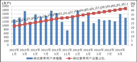圖2.2013-2014年移動寬帶用戶當(dāng)月凈增數(shù)和總數(shù)占比情況