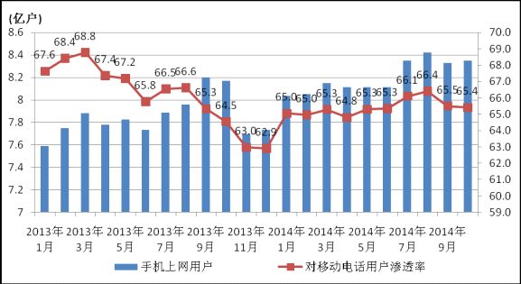 圖4 2013-2014年手機(jī)上網(wǎng)用戶和對移動電話用戶滲透率情況
