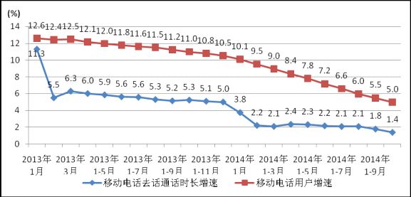 圖5. 2013-2014年各月移動話音業(yè)務(wù)量和移動用戶同比增長比較