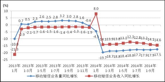 圖6. 2013-2014年各月移動短信業(yè)務(wù)量和移動短信收入同比增長情況