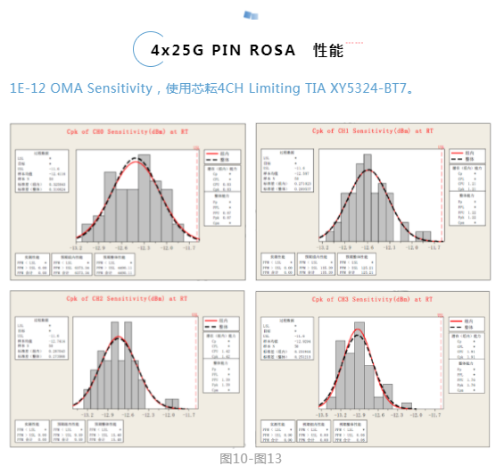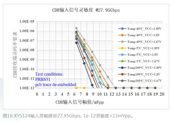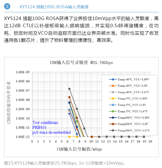 該方案實測指標(biāo)完全滿足IEEE802.3ba協(xié)議要求,收端靈敏度指標(biāo)可以實現(xiàn)3dB以上的余量(-11.6dBm@1e-12 OMA)。集成XY5324 TIA的PIN ROSA,搭配XY5124 CDR靈敏度全溫保證-11.6 dBm,典型值-12.5dBm,優(yōu)于目前業(yè)界主流國際大廠方案的表現(xiàn)。