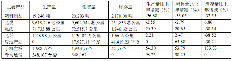 公司產(chǎn)銷情況,其中光纖生產(chǎn)1128.98萬芯公里,銷售1130萬芯公里;光纜產(chǎn)品生產(chǎn)961.9萬芯公里,銷售960.2萬芯公里,手機(jī)主板生產(chǎn)1688萬個,銷售1664萬個;電纜產(chǎn)品生產(chǎn)7.17萬公里,銷售7.25萬公里。