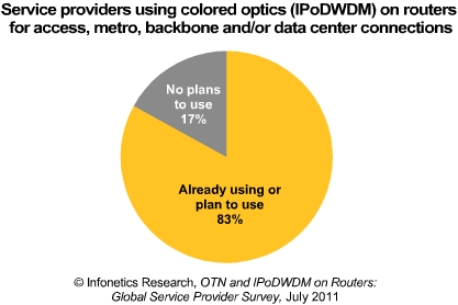 盡管與去年相比,計(jì)劃采用IPODWDM以及OTN路由器的運(yùn)營(yíng)商有83%,但到2012年真正計(jì)劃部署的將會(huì)減少,這在某種程度上反應(yīng)部署的延誤。