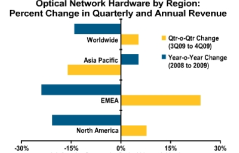 2009年第四季度,光網(wǎng)絡(luò)市場收入環(huán)比增長5%,但從全年收入來看,比2008年下降14%。