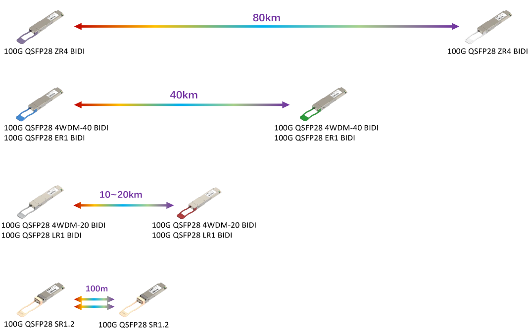 100G QSFP28 BIDI長(zhǎng)距系列模塊,適用于長(zhǎng)距離、低時(shí)延傳輸、光纖資源稀缺的應(yīng)用場(chǎng)景,可滿足城市之間或偏遠(yuǎn)鄉(xiāng)村的互聯(lián)、區(qū)域數(shù)據(jù)中心與邊緣數(shù)據(jù)中心的連接、企業(yè)內(nèi)不同園區(qū)機(jī)房之間的互聯(lián),5G匯聚機(jī)房至核心路由的互聯(lián)等需求。