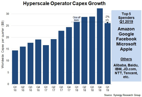 Synergy首席分析師John Dinsdale表示:“資本開支在2018年達到創(chuàng)紀錄水平后,Hyperscale運營商在今年第一季度稍微放緩了腳步。然而,盡管今年第一季度資本開支相比2018年同期有所下滑,但跟2017年第一季度相比增幅仍達56%,跟2016年第一季度比增長81%。我們預計接下來三個季度整體資本開支水平將反彈。這仍然是一場規(guī)模龐大的游戲,對那些希望與Hyperscale公司進行有意義競爭的公司來說存在巨大障礙。”