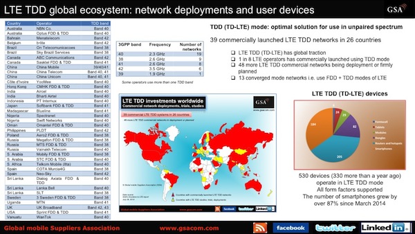 TDD制式的生態(tài)系統(tǒng)正在成熟和迅速成長(zhǎng)。在當(dāng)前所推出的39個(gè)LTE TDD商用網(wǎng)絡(luò)中有13個(gè)是使用結(jié)合系統(tǒng),其可以使用TDD和FDD兩種制式。