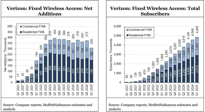 在 2025 年第一季度,Verizon 增加了 30.8 萬個(gè) FWA 用戶,而去年同期增加了 35.4 萬個(gè)用戶,分析師預(yù)計(jì) Verizon 本季度將增加約 33.2 萬個(gè) FWA 訂戶。其中,2025 年第一季度增加了 19.9 萬個(gè)住宅 FWA 用戶,低于去年同期的 20.3 萬個(gè);2025 年第一季度增加了 10.9 萬個(gè)商業(yè) FWA 用戶,低于去年同期的 15.1 萬個(gè)。