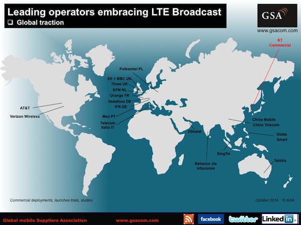 ICCSZ訊 近日,GSA(全球移動設(shè)備供應(yīng)商協(xié)會)發(fā)布其最新的關(guān)于LTE廣播的市場報告。GSA稱,目前LTE廣播技術(shù)(LTE組播)至少有19家移動運營商正在部署、測試或者研究之中,它們分布于澳大利亞、中國、法國、德國、印度、意大利、荷蘭、菲律賓、波蘭、葡萄牙、新加坡、韓國、阿聯(lián)酋、英國和美國。