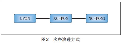 a) 次序演進(jìn)方式(見圖2)?,F(xiàn)有的GPON系統(tǒng)需要首先演進(jìn)到XG-PON系統(tǒng),在同一ODN中保持GPON與XG-PON共存一段時(shí)期。當(dāng)需要向NG-PON2演進(jìn)時(shí),由于只有XG-PON系統(tǒng)可以演進(jìn)到NG-PON2,可以與NG-PON2在同一ODN共存,因此需要確保此時(shí)GPON系統(tǒng)已經(jīng)從ODN中移除。
