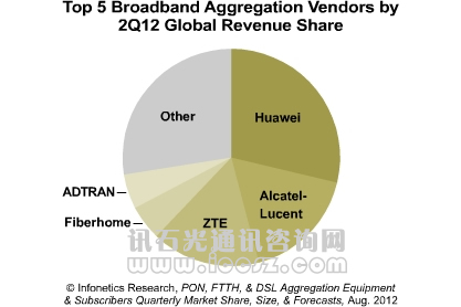 華為在2012Q2保持其全球?qū)拵R聚設(shè)備市場的領(lǐng)導(dǎo)地位;阿朗贏得了中國電信和中國聯(lián)通的GPON合同,地位稍微提振,超過中興躍居第二。