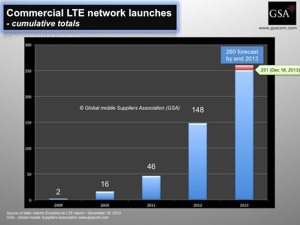 ICCSZ訊 2013年12月18日,GSA確認到目前為止在93個國家或地區(qū)已經有251張LTE商用網絡被推出。