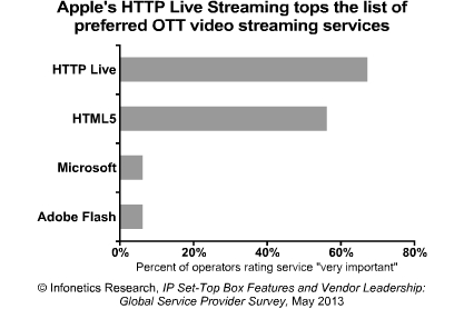 Infonetics公司寬帶接入和付費電視首席分析師Jeff Heynen稱,蘋果的HTTP直播榮登視頻流媒體服務的榜首,其次是HTML5,經(jīng)營者認為提供過頂視頻是非常重要的。我們預計HTML5的采購將增長,特別是如果W3C增加新的安全功能(用戶最關心的問題),因為它可以跨越多個平臺迅速擴展,并已經(jīng)獲得了蘋果、谷歌、三星、微軟、Netflix、亞馬遜、Facebook和LinkedIn的支持。